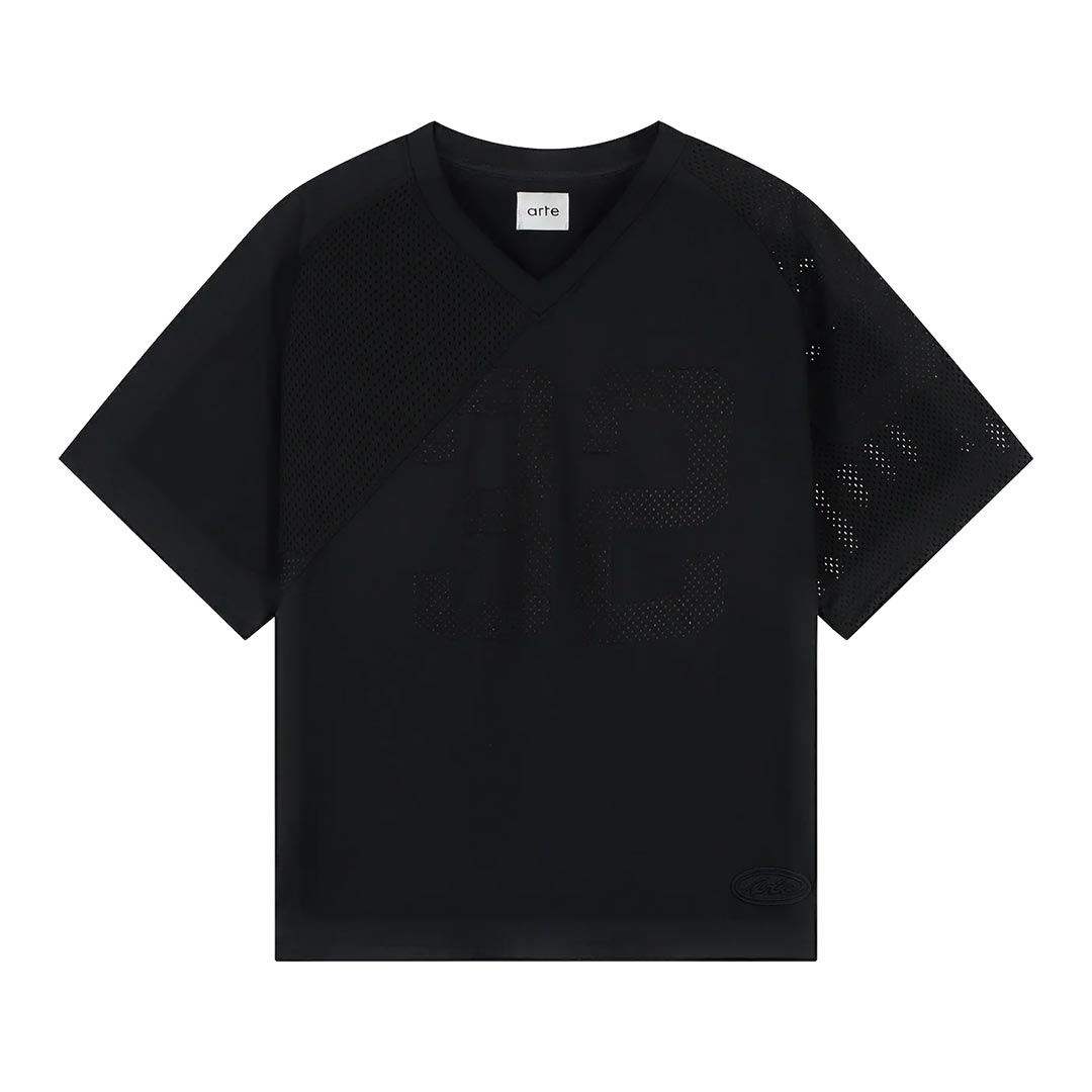 Realizzata in nylon di alta qualità, la maglia è pensata per incarnare il tema decostruito e retrospettivo della collezione. Il numero “32” è presente in modo distorto su tutta la superficie, separato da cuciture. La maglia è completata da una patch con il logo Arte, simbolo della stagione, ricamata nella parte inferiore anteriore.