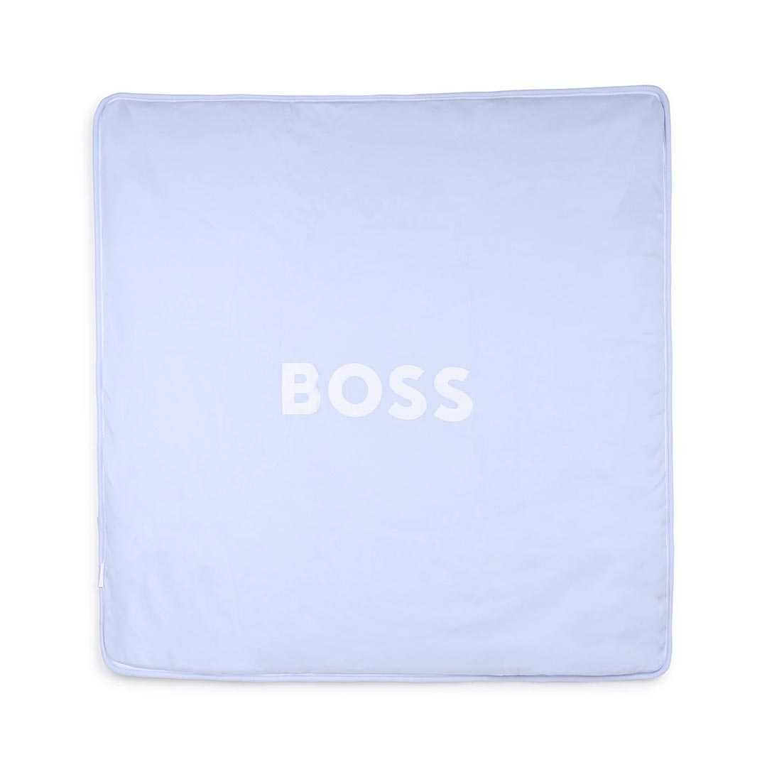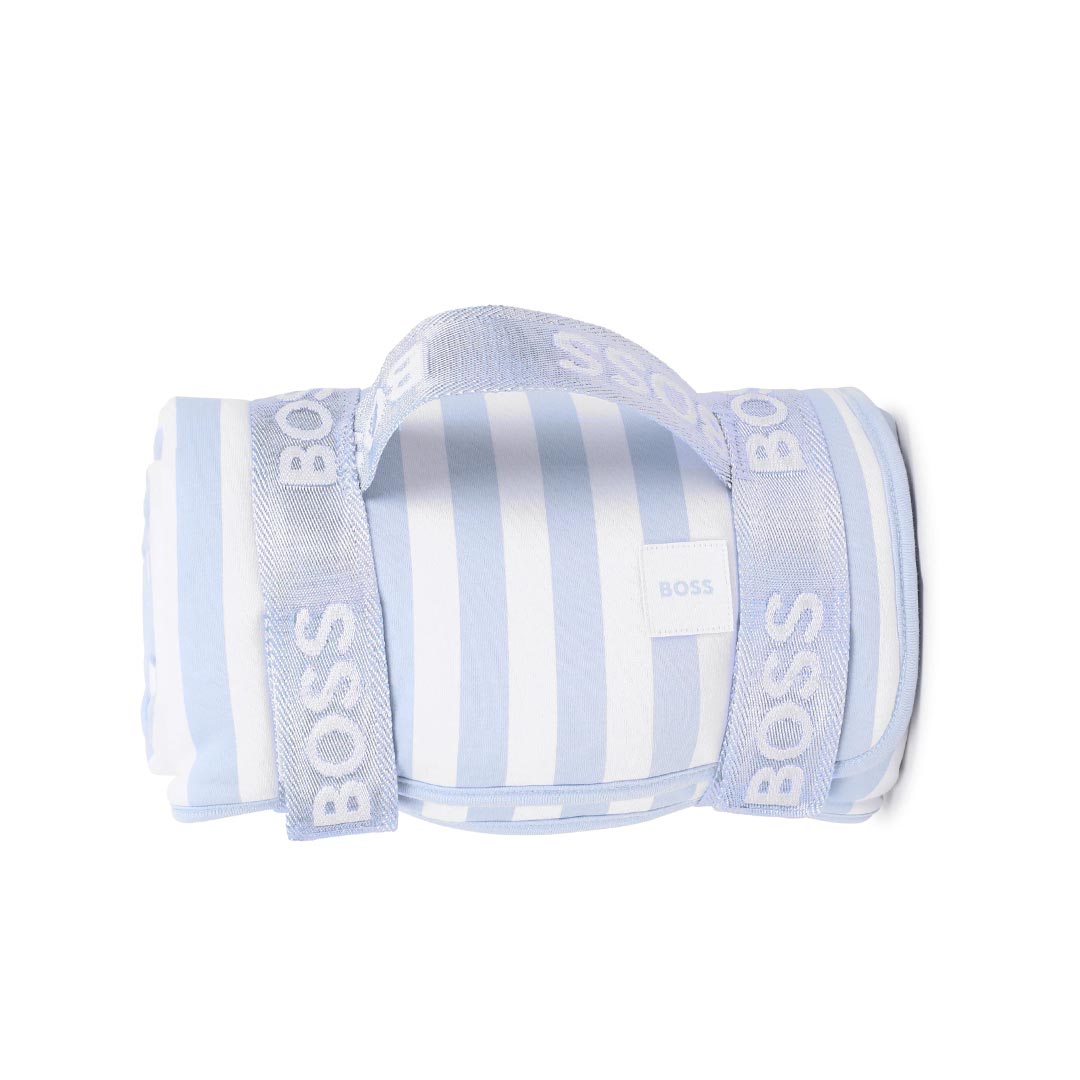 Coperta celeste a righe, leggermente imbottita, con retro celeste e logo bianco; é decorata con patch logato. Dimensioni (L x A): 76cm x74cm.