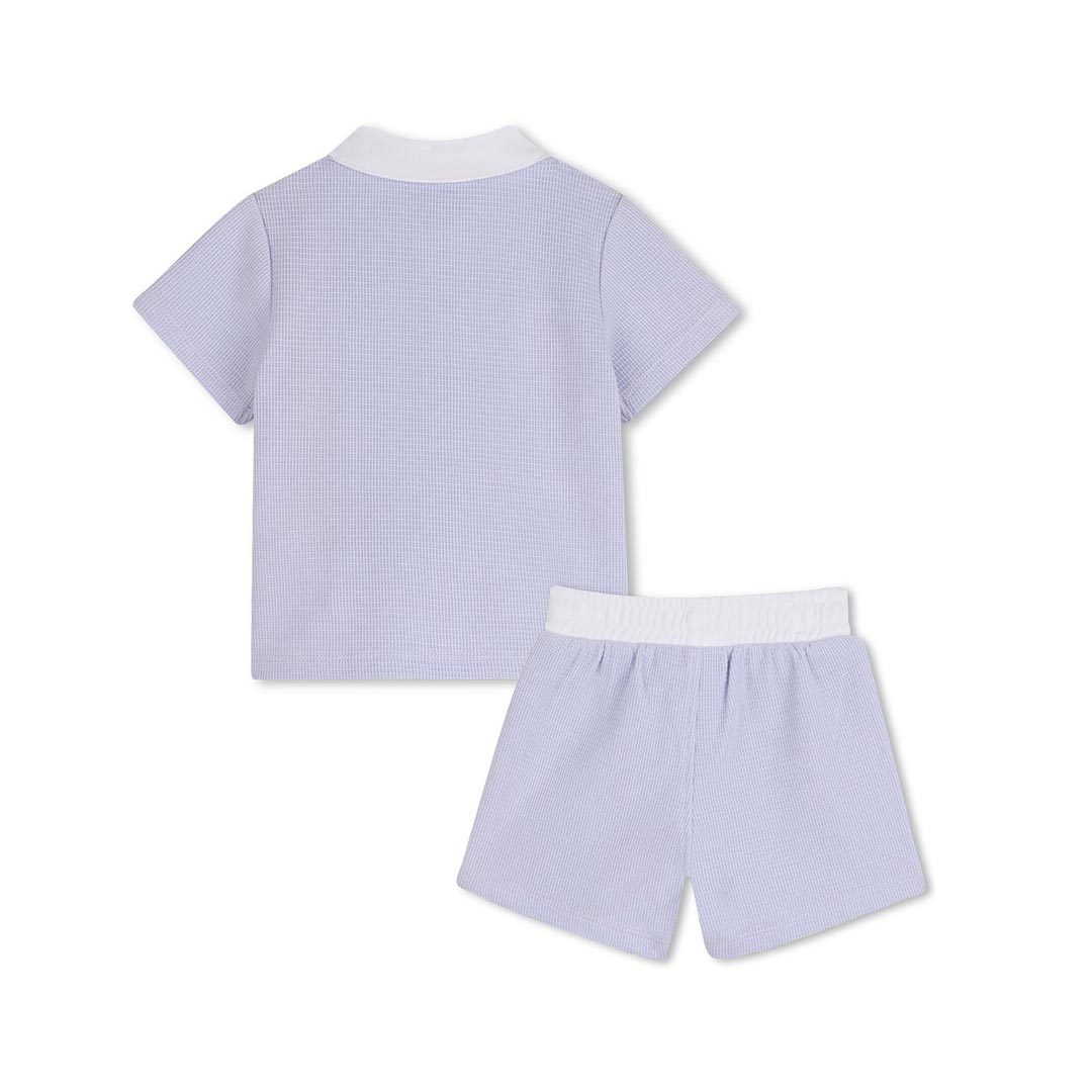 Completo 2 pezzi composto da polo e pantaloncini azzurri con finiture bianche.