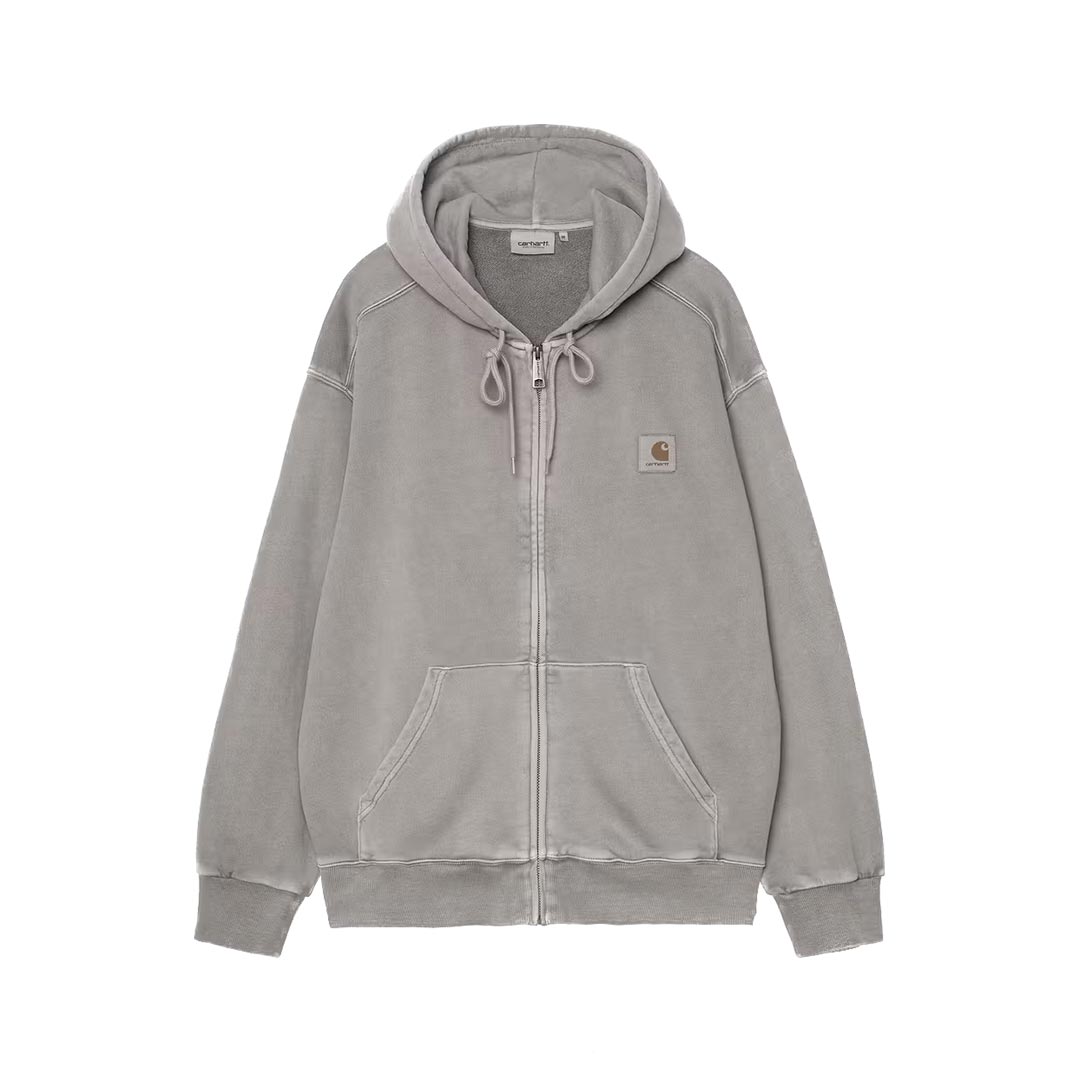 La Hooded Nelson Jacket è realizzata in pesante jersey di cotone non spazzolato, per una fattura loopback testurizzata. Il taglio a palloncino rende la giacca più ampia e comoda, ed è contraddistinta anche da spalle scese e finiture a coste. Il modello è stato inoltre tinto in capo per maggior morbidezza e una tonalità vissuta ma intensa. Sulla sinistra del petto campeggia un’etichetta quadrata in tessuto, colorata dal processo di tintura in capo.