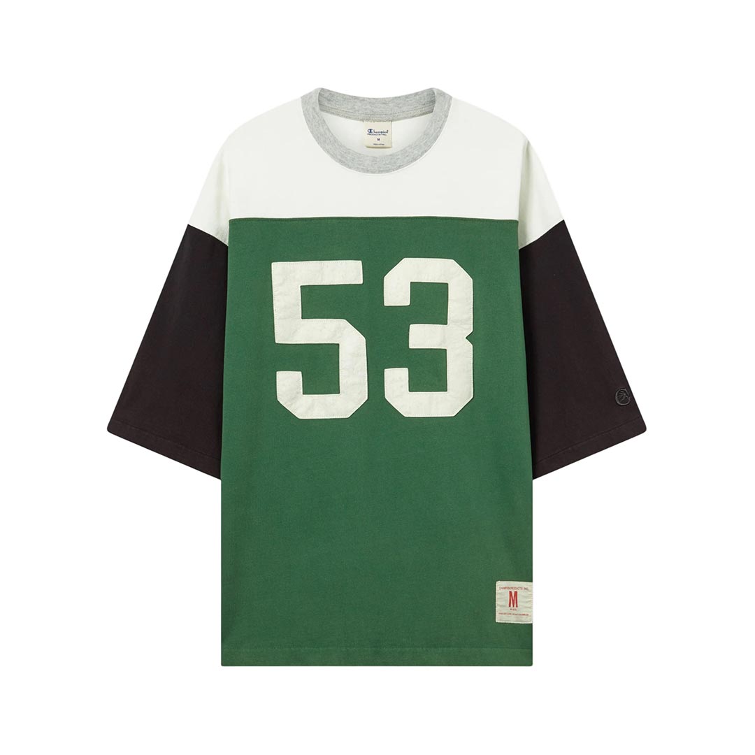 T-shirt da uomo con maniche a 3/4 ispirata alle maglie da football americano degli anni ’70. Realizzata in jersey di cotone, presenta una struttura compatta e un aspetto deciso, tipico dell’abbigliamento sportivo d’archivio. Il design con maniche a contrasto e grafica numerica sul petto richiama lo stile heritage reinterpretato in chiave contemporanea, in linea con l’estetica della selezione Time Capsule.