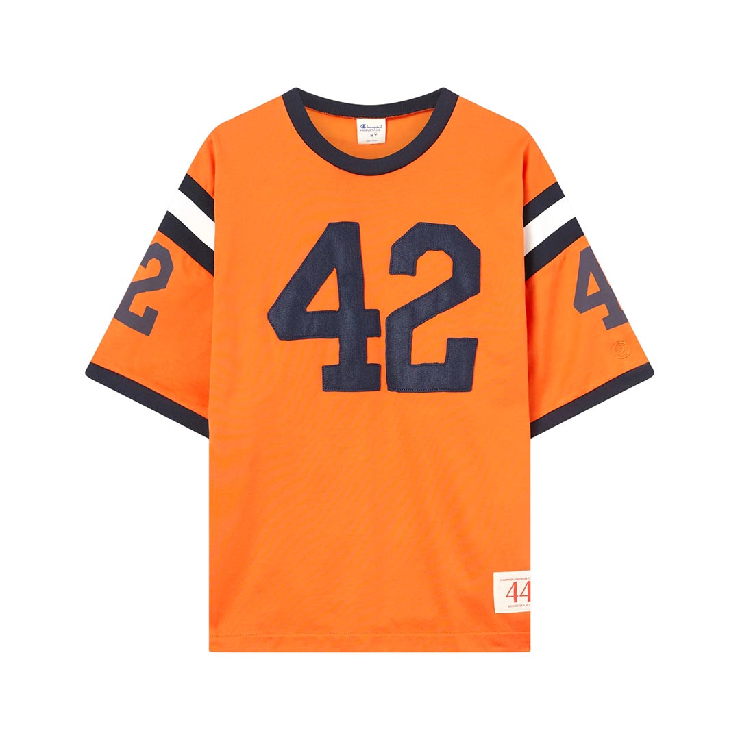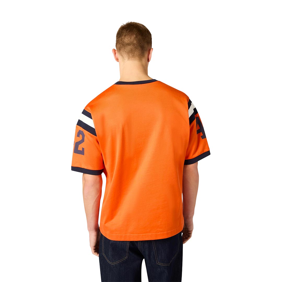 T-shirt ringer da uomo ispirata alle maglie da gioco del football americano degli anni ’70. Realizzata in jersey di nylon e cotone, presenta una struttura compatta e un aspetto deciso, tipico dell’abbigliamento sportivo d’archivio. Il design con maniche corte, dettagli a contrasto su collo e maniche e grafica numerica sul petto richiama lo stile heritage reinterpretato in chiave contemporanea, in linea con l’estetica della selezione Time Capsule.