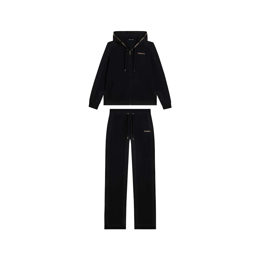 Realizzata in felpa garzata elasticizzata, questa tuta ha un look sportivo e luminoso. La felpa con zip e fascia in costina è completata da un cappuccio regolabile con coulisse, foderato in morbido jersey. Le maniche lunghe hanno polsini in costina per una migliore aderenza. I pantaloni presentano gamba dritta, vita in costina con coulisse e una vestibilità comoda. Il logo Freddy color oro decora con eleganza il bordo del cappuccio, il cuore e il fianco sinistro dei pantaloni. La felpa è dotata di tasche interne pratiche e discrete.