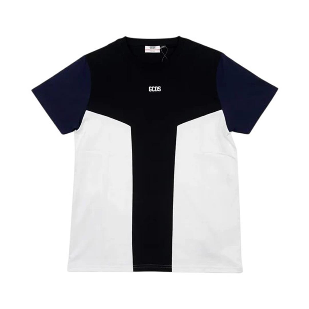 T-shirt in cotone con pannelli color block a contrasto e logo GCDS ricamato sul petto. Girocollo con bordi rifiniti a costine.