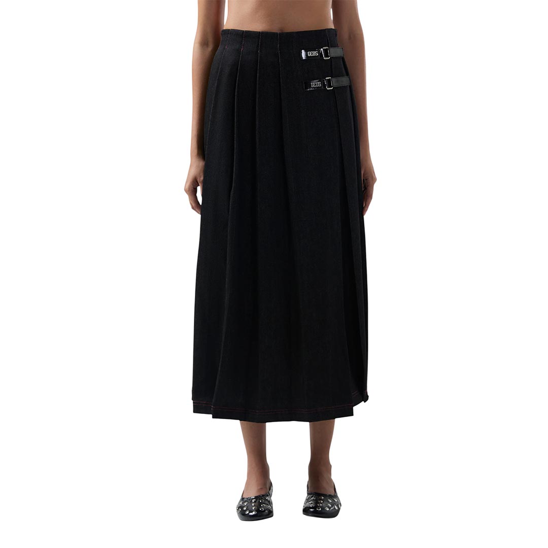 Gonna lunga in denim con ampie pieghe e vita alta. Chiusura laterale con zip.