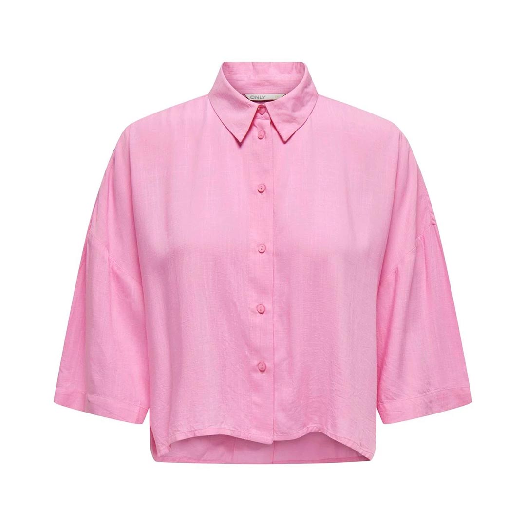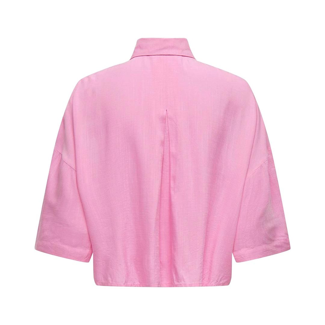 Il collo camicia e la chiusura con bottoni mantengono uno stile classico, mentre le maniche 2/4 con spalle cadenti offrono un fit rilassato e moderno. Il taglio cropped, leggermente più lungo sul retro, aggiunge movimento e contemporaneità alla silhouette, rendendola perfetta da indossare con pantaloni a vita alta o gonne.