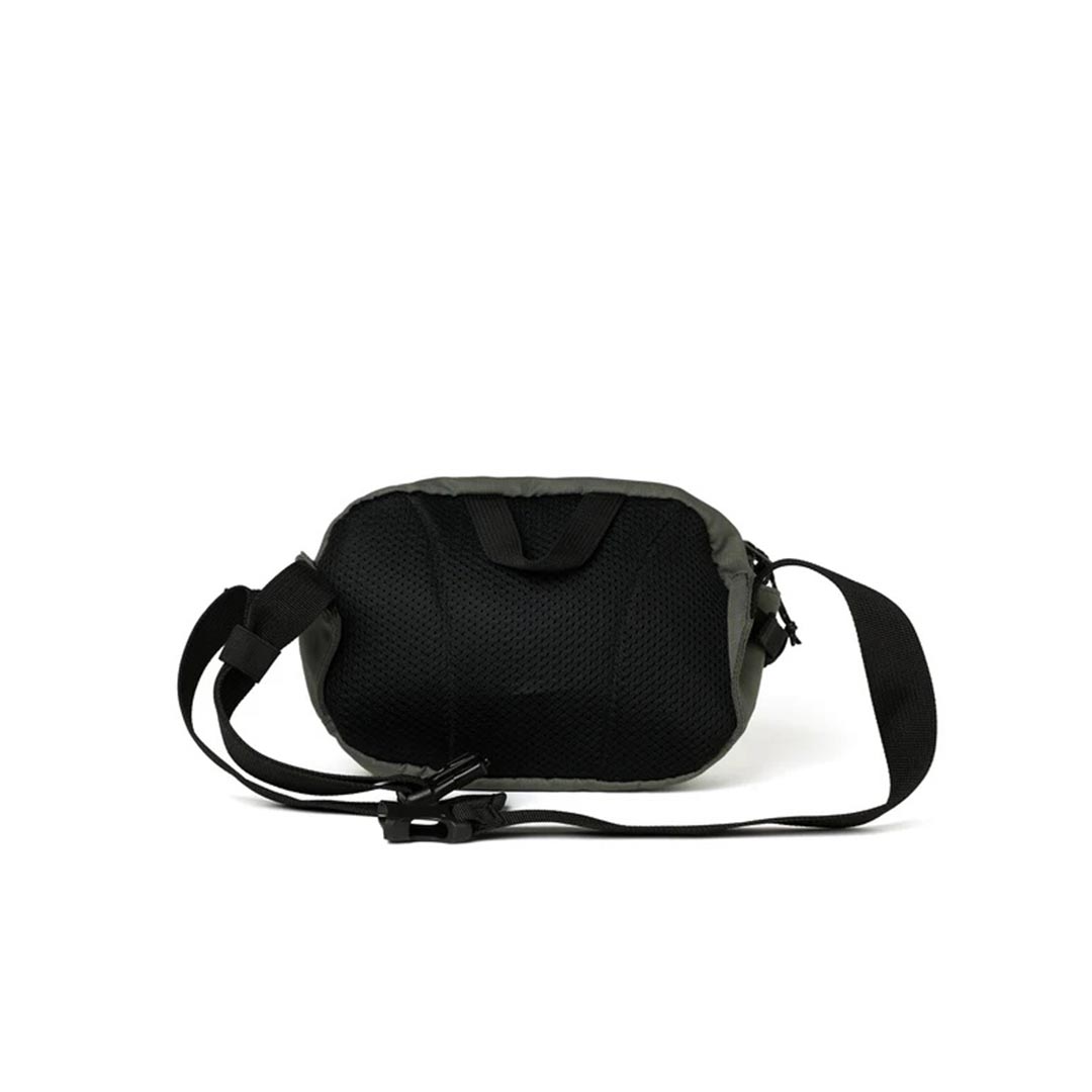 Borsa nera in nylon ripstop con rivestimento in PU idrorepellente da 1500 mm e fodera in poliestere. Silhouette compatta con pannello posteriore imbottito in rete traspirante. Rifinita con cerniere YKK e discreta etichetta tessuta. Dimensioni: 25 x 16 x 8 cm