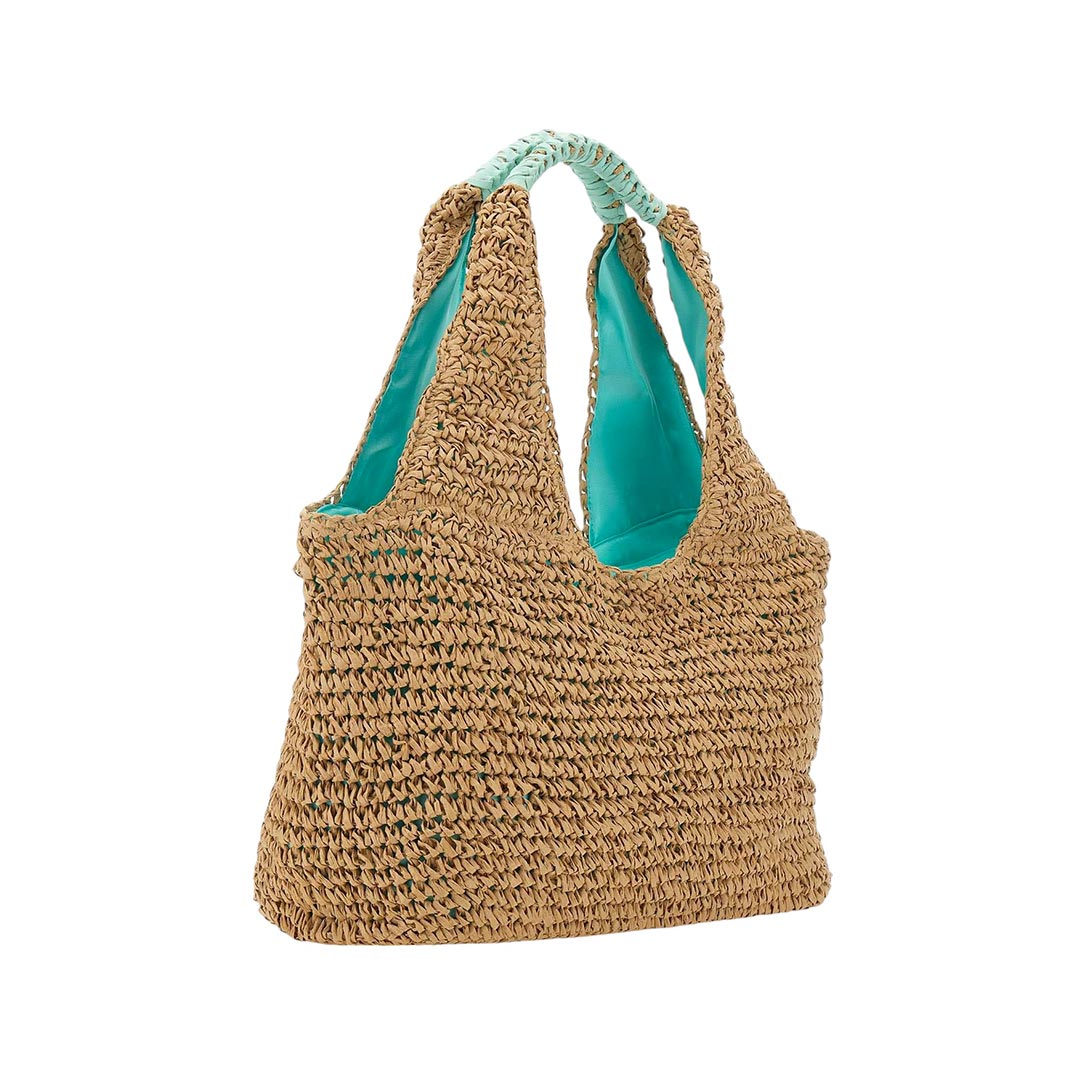 Maxi bag in paper straw intrecciata con chiusura centrale zip e manico. Capiente e originale nel design.
