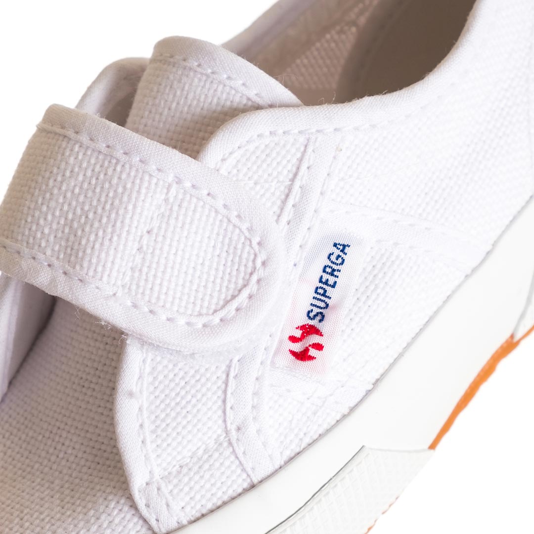 Massimo stile già dai primi passi. Questa Superga 2750 in versione baby presenta tomaia in tela di cotone, punta arrotondata e suola in gomma vulcanizzata tipica del brand. La chiusura con strap è un dettaglio super funzionale che assicura una calzata comoda e veloce.